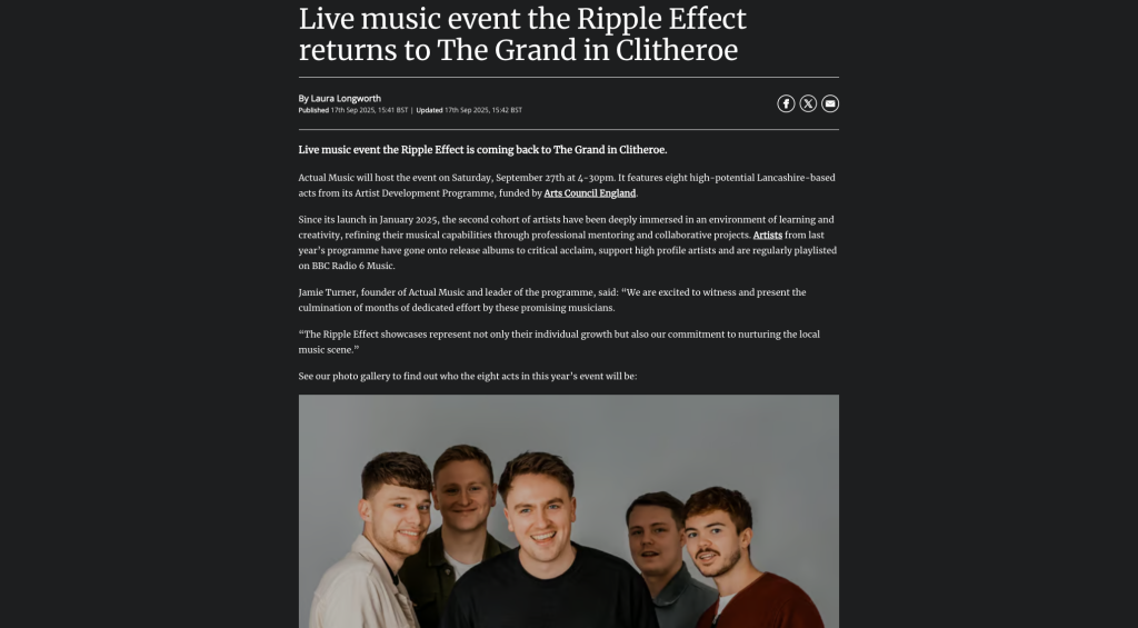 βThe Actual Music team did a phenomenal job with their βRipple Effectβ showcase, highlighting the level of talent within Lancashire, and providing them with a platform to perform to a new audience, and develop their experiences in both a live and studio setting.β – The Empire Police